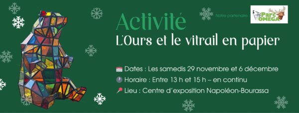 À l’occasion du Marché de Noël de Montebello, le Centre est heureux de proposer deux sessions de « L’Ours et le vitrail en papier », une activité créative inspirée de l’œuvre L’Ours et la clarté, réalisée par l’artiste Mustapha Chadid et exposée devant le Centre.